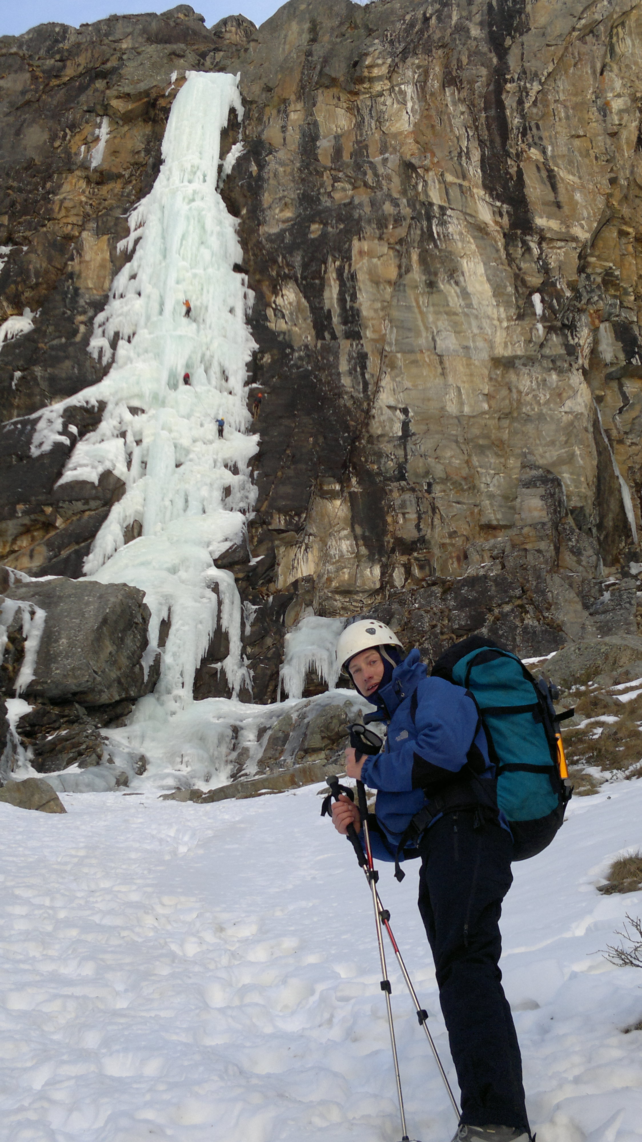 Today … great intentions to do Super Repentance but it just didn’t happen due to me! Both of us were super keen and confident.  Arrived at the bottom to find two parties already on it (italian and german?) and another party to the right on a big fat icefall (which they proceeded to try and demolish!!). We waited.