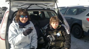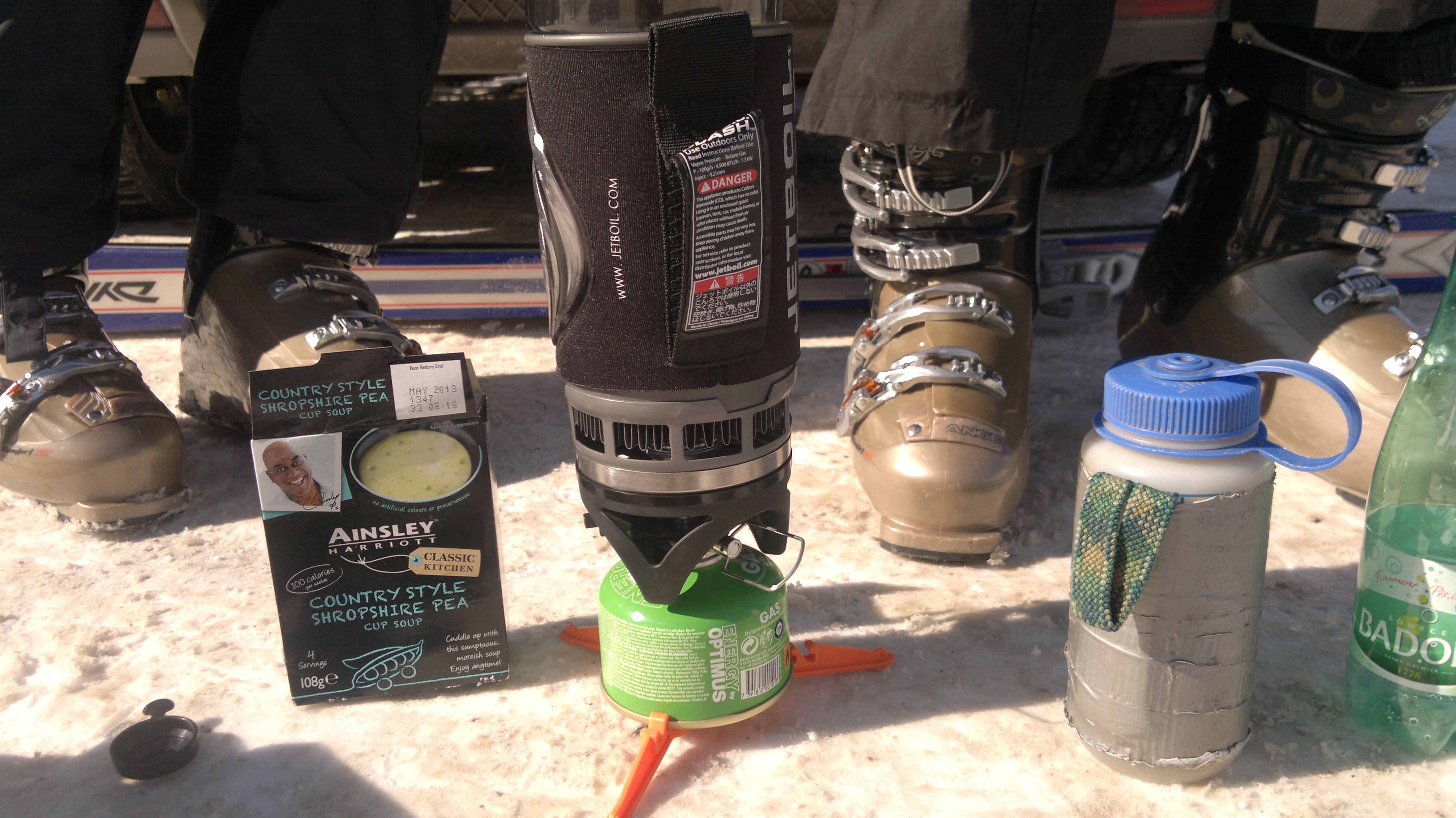 Okay we had had enough of the cold so we went ski-ing on the sunny side of the valley 🙂 -5deg C. True to our Yorkshire roots we used the jet boil stove to make some nice tasty soup outside the car!